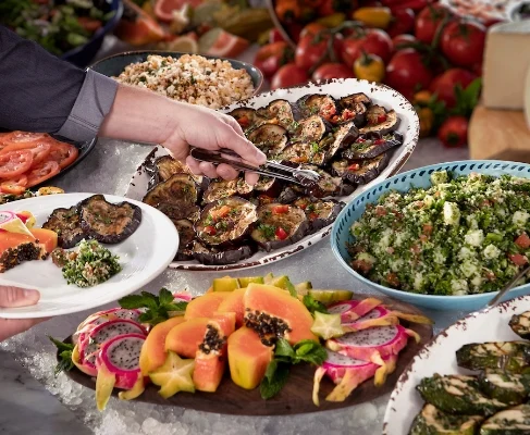Disfruta de platos vegetales, ensaladas gourmet, legumbres, verduras, frutas en nuestra Mesa de Mercado y Feijoada Bar.