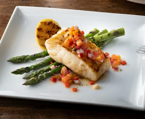 Platos Destacados: Salmón a la plancha, Cortes premium de carne, Bife de coliflor asado, Verduras asadas, Ensaladas de temporada, frutas.